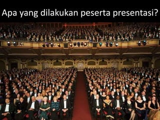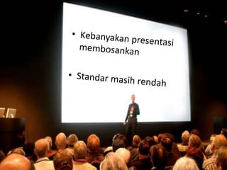 Dokumen ini memberikan panduan tentang cara membuat presentasi yang efektif, menekankan pentingnya desain slide, pemilihan teks, dan penggunaan gambar. Terdapat 4 strategi utama untuk presentasi yang sukses yaitu mengorganisir, memanfaatkan media, berlatih, dan menciptakan kesenangan dalam penyampaian. Selain itu, penekanan pada menjaga kesederhanaan dan konsistensi dalam desain slide juga sangat ditekankan.