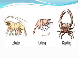 Dokumen ini membahas tentang filum Arthropoda, khususnya subclass Crustacea dan Arachnida, dengan menggambarkan ciri-ciri fisik, klasifikasi, sistem organ, serta peran masing-masing dalam ekosistem dan kehidupan manusia. Crustacea dikelompokkan menjadi entomostraca dan malakostraca, yang memiliki peran penting sebagai sumber makanan dan dalam ekosistem, sedangkan Arachnida mencakup berbagai spesies dengan peran pengendalian populasi serangga, meskipun beberapa spesies juga dapat merugikan. Informasi ini mencakup sistem pencernaan, pernapasan, dan reproduksi serta dampak positif dan negatif dari kedua kelompok hewan ini terhadap manusia.