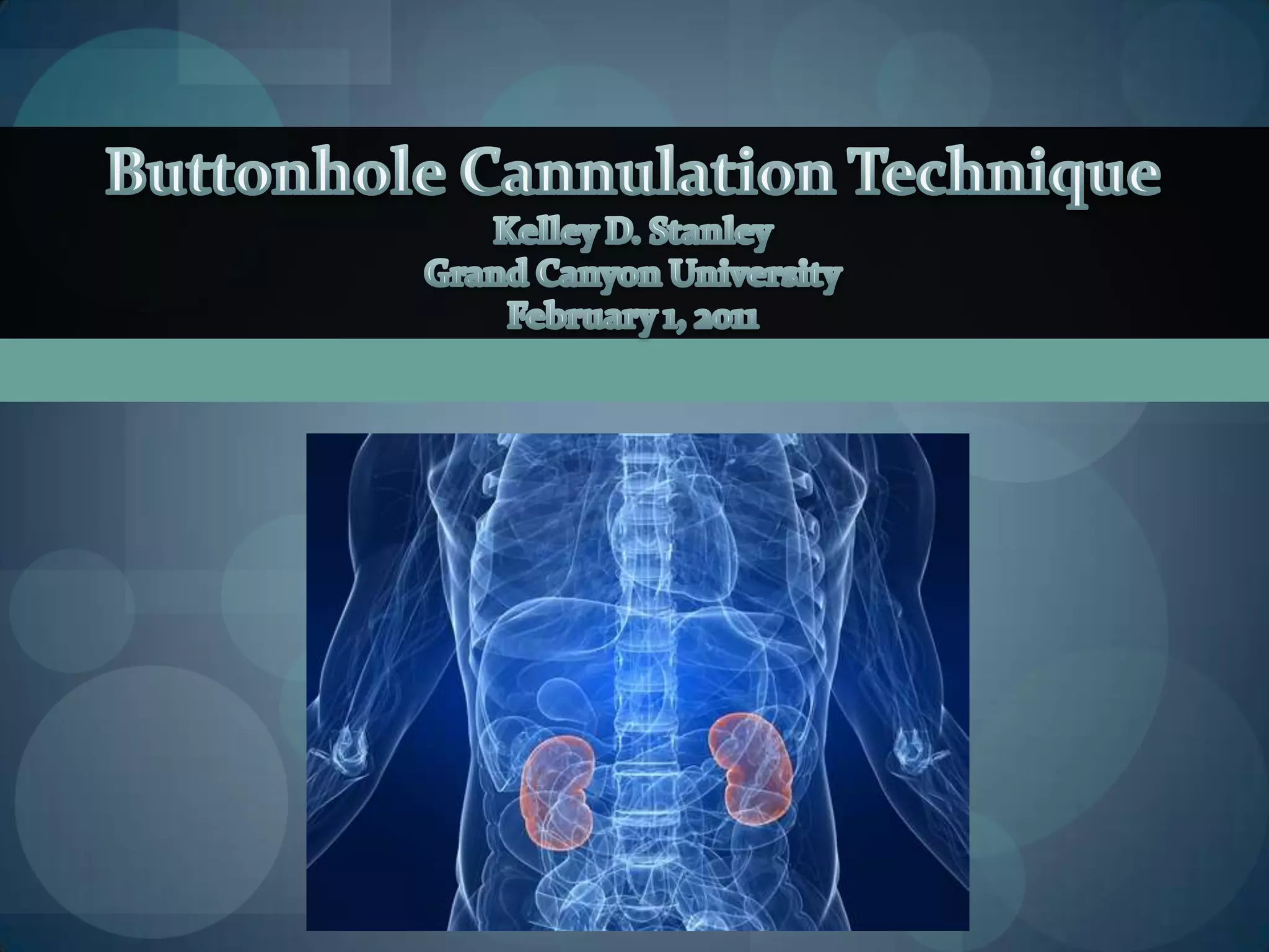 The document discusses the buttonhole cannulation technique for vascular access in dialysis patients. It provides background on dialysis patients and costs in the US. The buttonhole technique creates fixed puncture sites in an arteriovenous fistula to reduce complications from cannulation. The literature review found the technique reduces pain and complications compared to the rope-ladder technique and has been used successfully in Europe for over 30 years. The document proposes evaluating the buttonhole technique for reducing cannulation pain, anxiety, and complications compared to the rope-ladder technique in outpatient dialysis clinics.