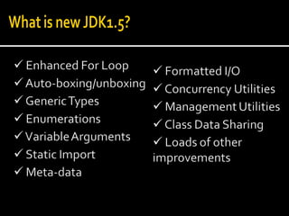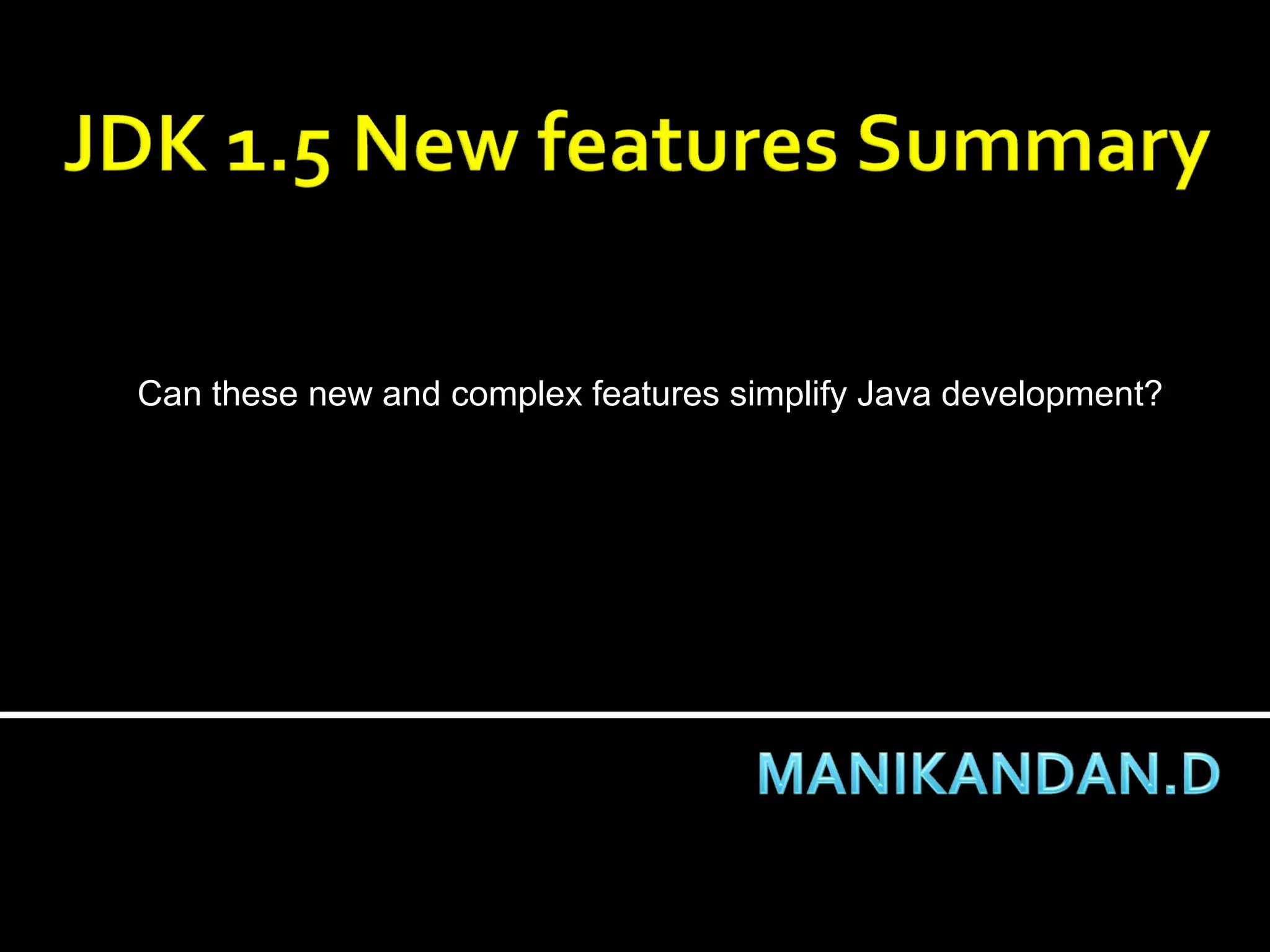 The document discusses several new features introduced in Java 5 that aim to simplify Java development: