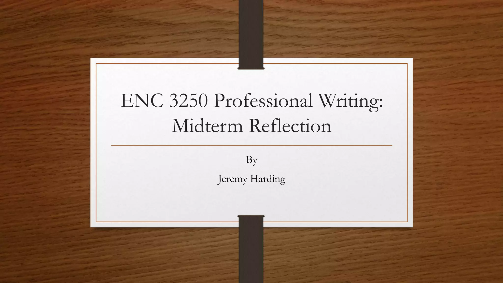 This midterm reflection summarizes Jeremy Harding's learning in the ENC 3250 Professional Writing course. It covers key aspects of the writing process like outlining and revision. It also discusses effective workplace communication tools like email, social media, and formatting techniques. Harding reflects on utilizing resources like the writing center and professor meetings to learn course material. Going forward, he aims to continue developing skills in organizing, concise writing, and obtaining feedback to improve his learning.