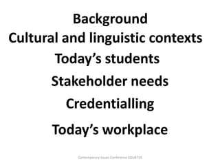 The document discusses the challenges of implementing a Canadian technical curriculum at a college in Qatar. It notes low English levels, different cultural backgrounds, and the need to align the curriculum with Qatar's context. It also discusses the changing needs of today's students and workplaces, including the importance of digital literacies and utilizing Web 2.0 technologies. The college has worked to address issues through measures like establishing a School of Language Studies and revising the curriculum to incorporate new literacies while maintaining academic integrity.