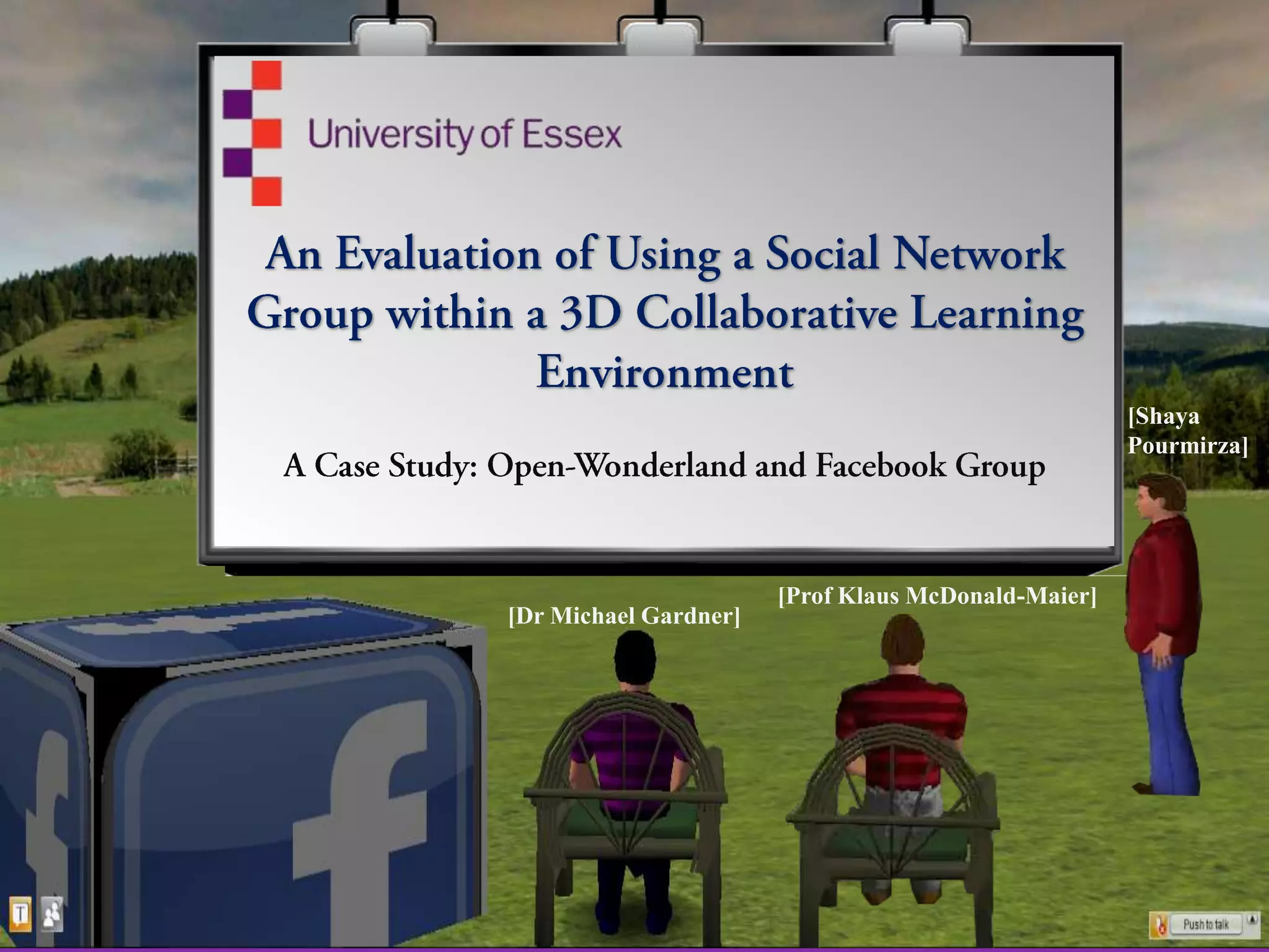 The document discusses integrating social networking features like Facebook into virtual learning environments. It proposes a system where students can authenticate with Facebook to access virtual classrooms and collaborate on group projects. The system would allow importing Facebook profiles and comments into virtual discussions. Diagrams show how the social and virtual components would connect and how data would flow between the systems. User studies found students had mixed opinions on using social media and virtual worlds for education.