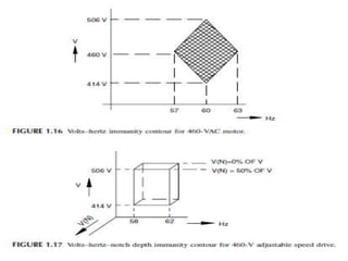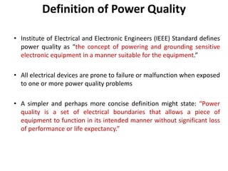 Power quality refers to maintaining the electric power within acceptable tolerances to allow devices to function properly without loss of performance. It is defined by parameters such as voltage, frequency and purity of waveform. Poor power quality can be caused by issues like sags, swells, transients, harmonics and grounding problems. The susceptibility of electrical equipment depends on the weakest component. While all devices are susceptible to some degree, the goal is to balance maintaining adequate power quality with designing equipment to have sufficient immunity to power quality issues.