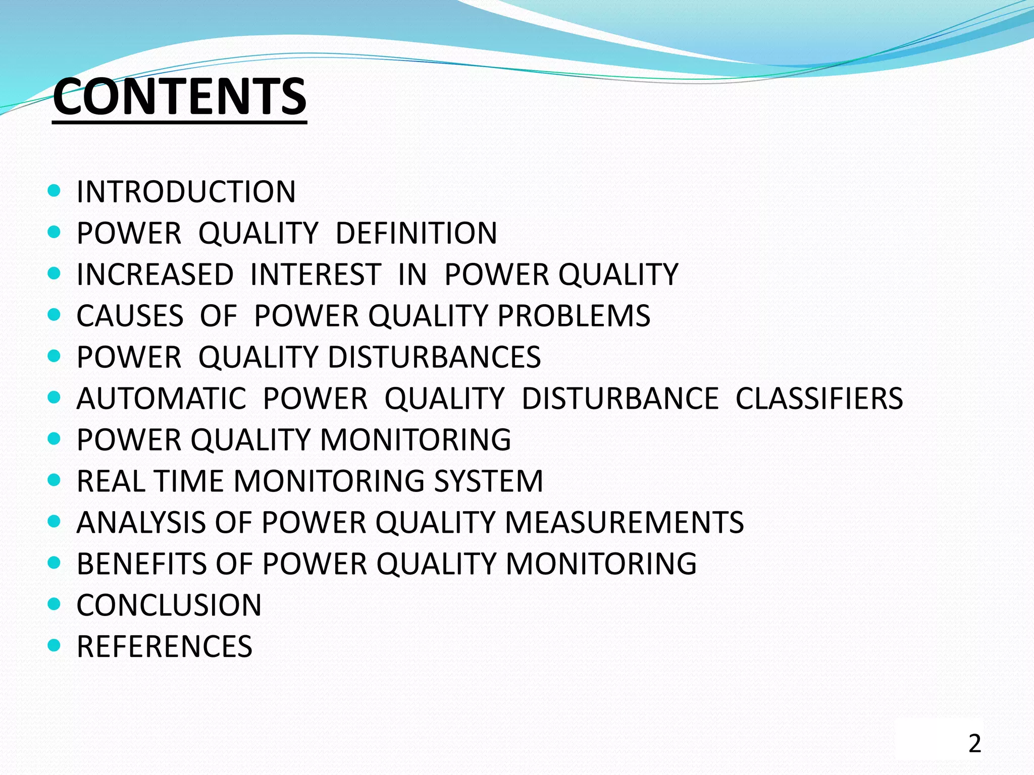 The document provides an overview of power quality monitoring and automatic power quality disturbance classification. It defines power quality and discusses increased interest in power quality. It describes various power quality disturbances like voltage fluctuations, harmonics, sags, and swells. It then discusses automatic power quality disturbance classifiers which use techniques like segmentation, feature extraction, and classification to identify different disturbance types. Neural networks and expert systems are presented as methods for automatic classification. The document emphasizes the importance of power quality monitoring and classification systems.
