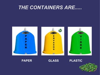 This document provides instructions for recycling paper, glass, and plastic containers. Paper items like boxes, cardboard, newspapers, and magazines are recycled in one container. Glass bottles and containers go in another recycling bin. Plastic items such as water bottles, bags, containers and polystyrene trays are recycled in a third separate container. The document encourages sorting the different materials into the proper recycling bins.