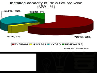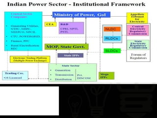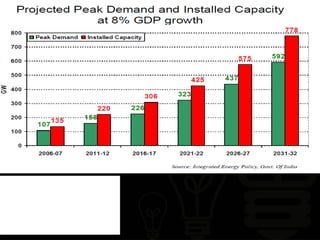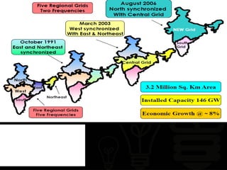 The document discusses India's integrated energy policy and progress towards electricity sector reforms. It notes that India needs to increase primary energy supply 3-4 times and electricity supply 5 times by 2031-32 to sustain high economic growth. Key objectives are energy security, reliability, affordability and meeting needs in a sustainable manner. National programs like RGGVY have expanded rural electrification but losses and deficits remain high in many states. Continued reforms, infrastructure investments and adoption of new technologies are needed across generation, transmission and distribution.
