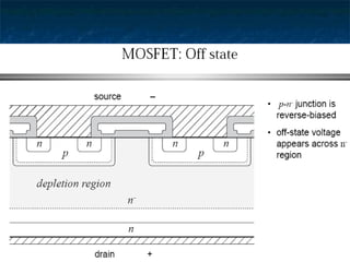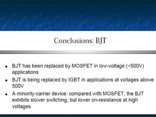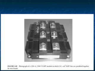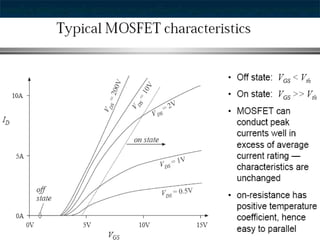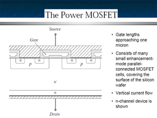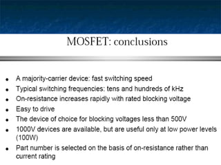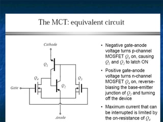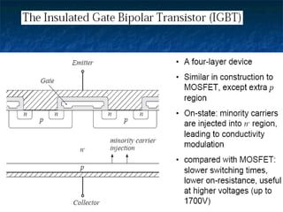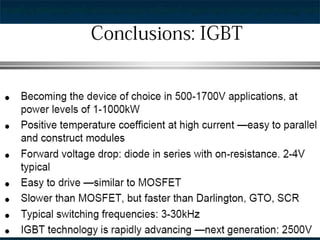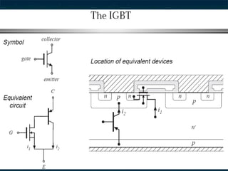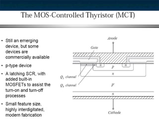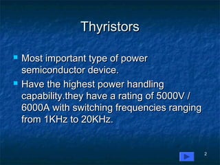 This document provides information about thyristors, which are the most important type of power semiconductor device. Thyristors have the highest power handling capability of semiconductor devices, with ratings up to 5000V/6000A and switching frequencies from 1-20kHz. Thyristors are inherently slow switching devices compared to other devices like BJTs and MOSFETs. Thyristors can be turned on by their gate but not turned off, making them useful as latching switches. The document discusses thyristor structure, operation, characteristics, types including phase control, fast switching, GTOs and TRIACs, and specifications like voltage and current ratings.