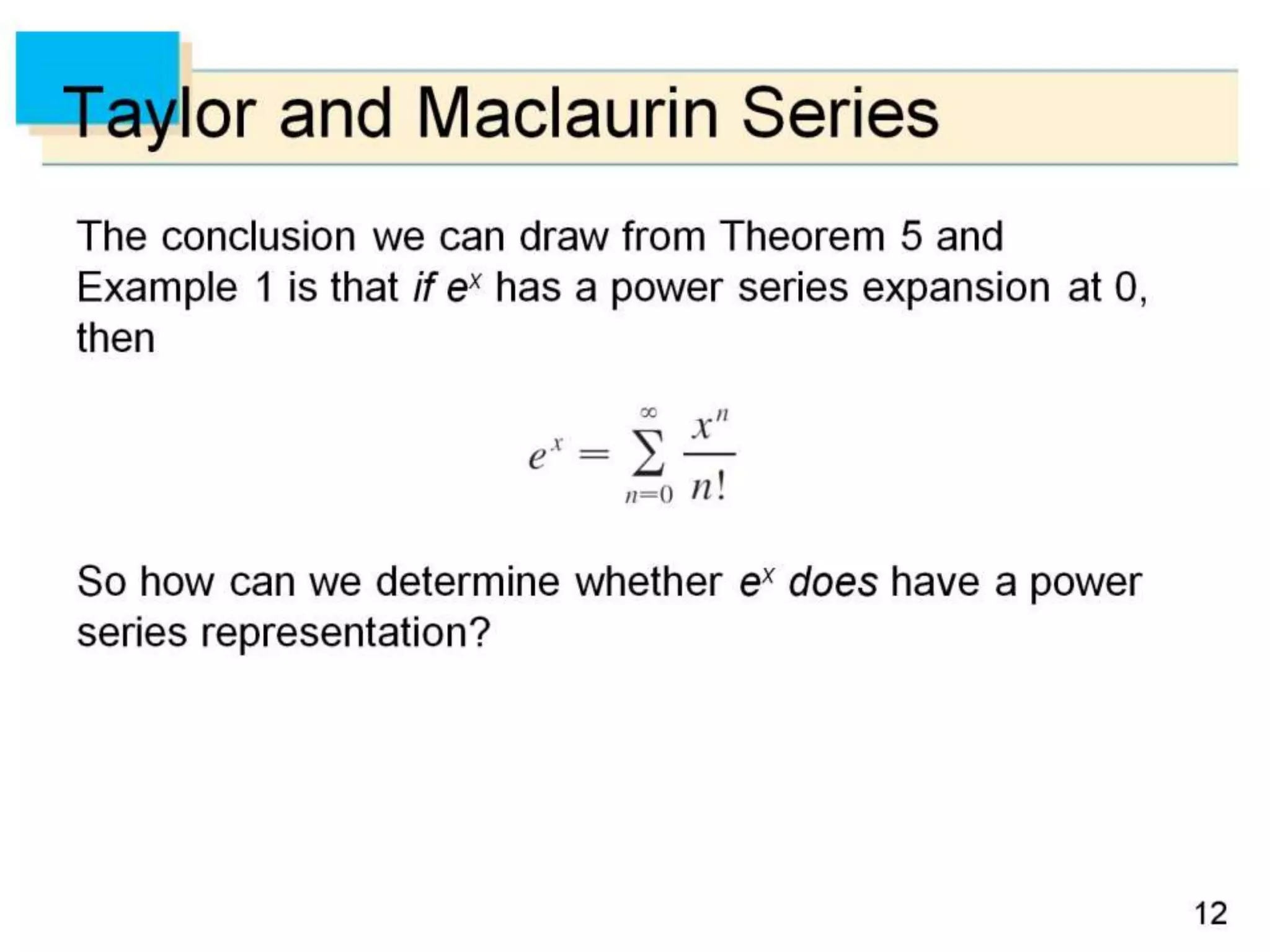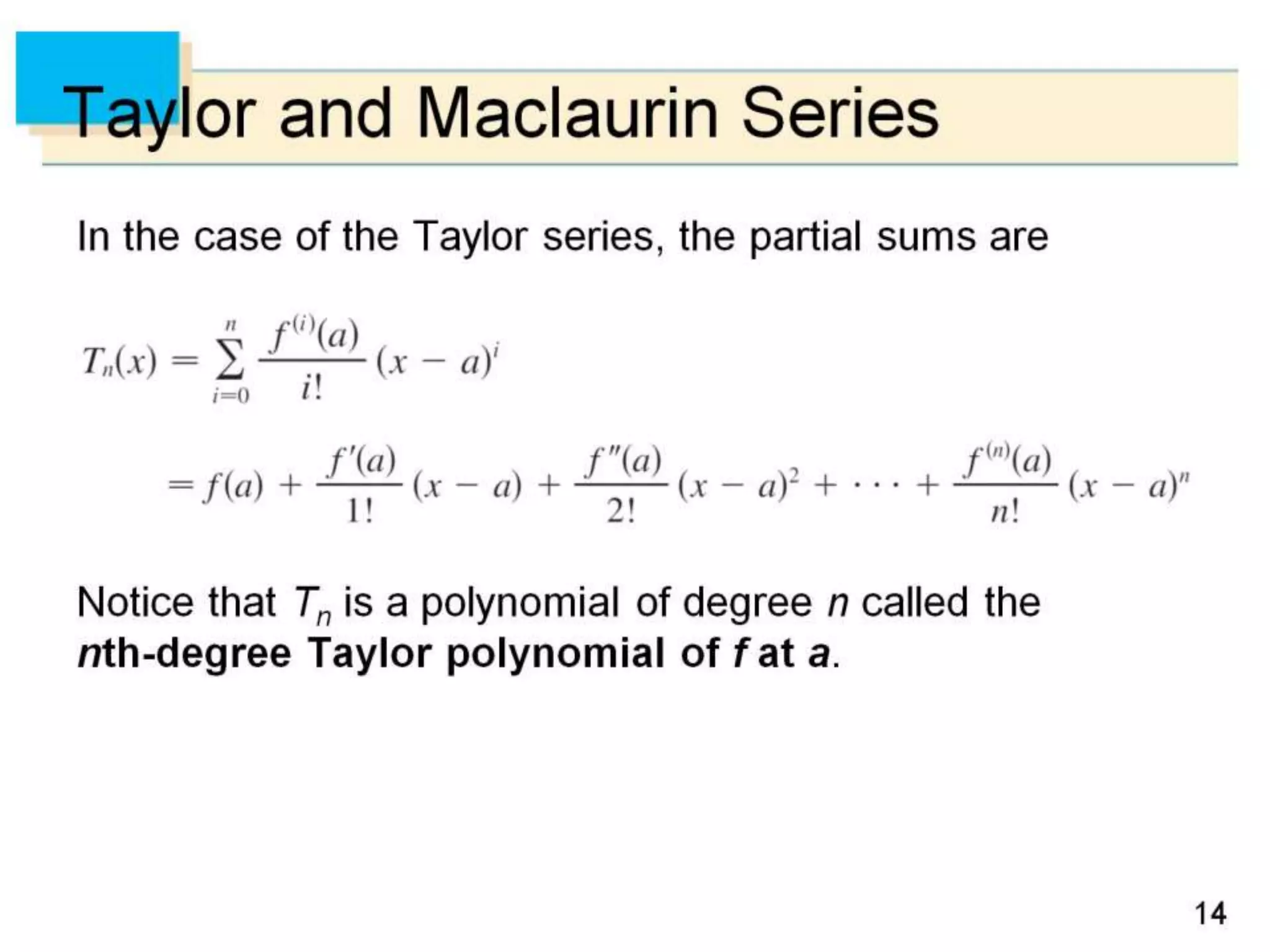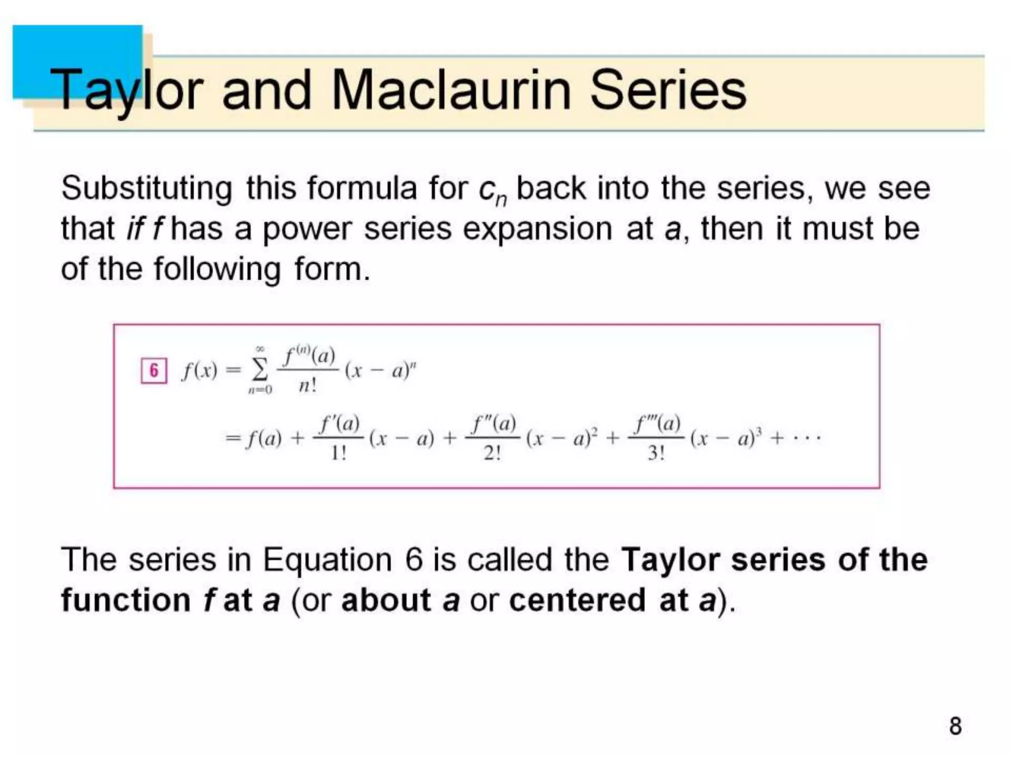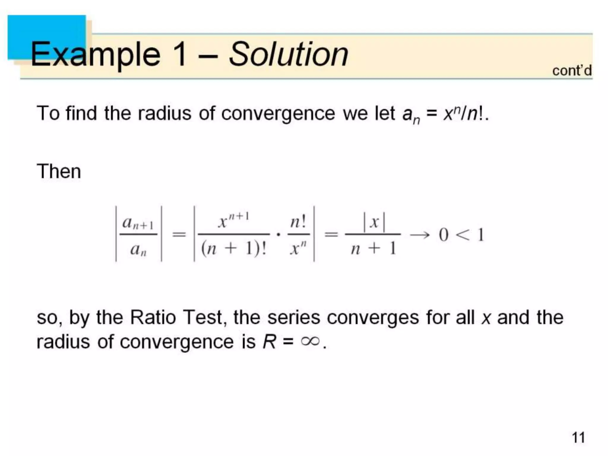 The document defines power series as sums of terms involving constants multiplied by powers of x, where x can be centered at 0 or another constant a. It states the convergence theorem for power series: if a power series converges at a point c ≠ 0, then it converges absolutely for all x within |c|, and if it diverges at a point d, then it diverges for all x outside |d|. It introduces the radius of convergence R, where a power series converges absolutely for |x-a|<R and diverges for |x-a|>R, regardless of what happens exactly at R.
