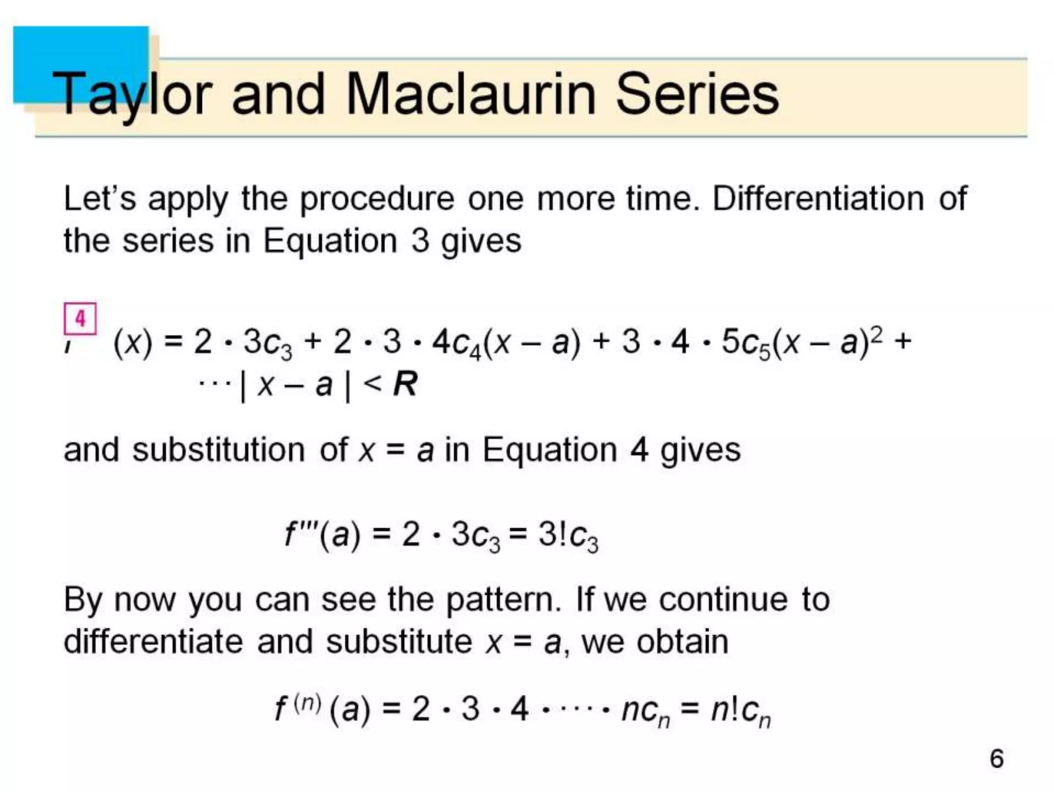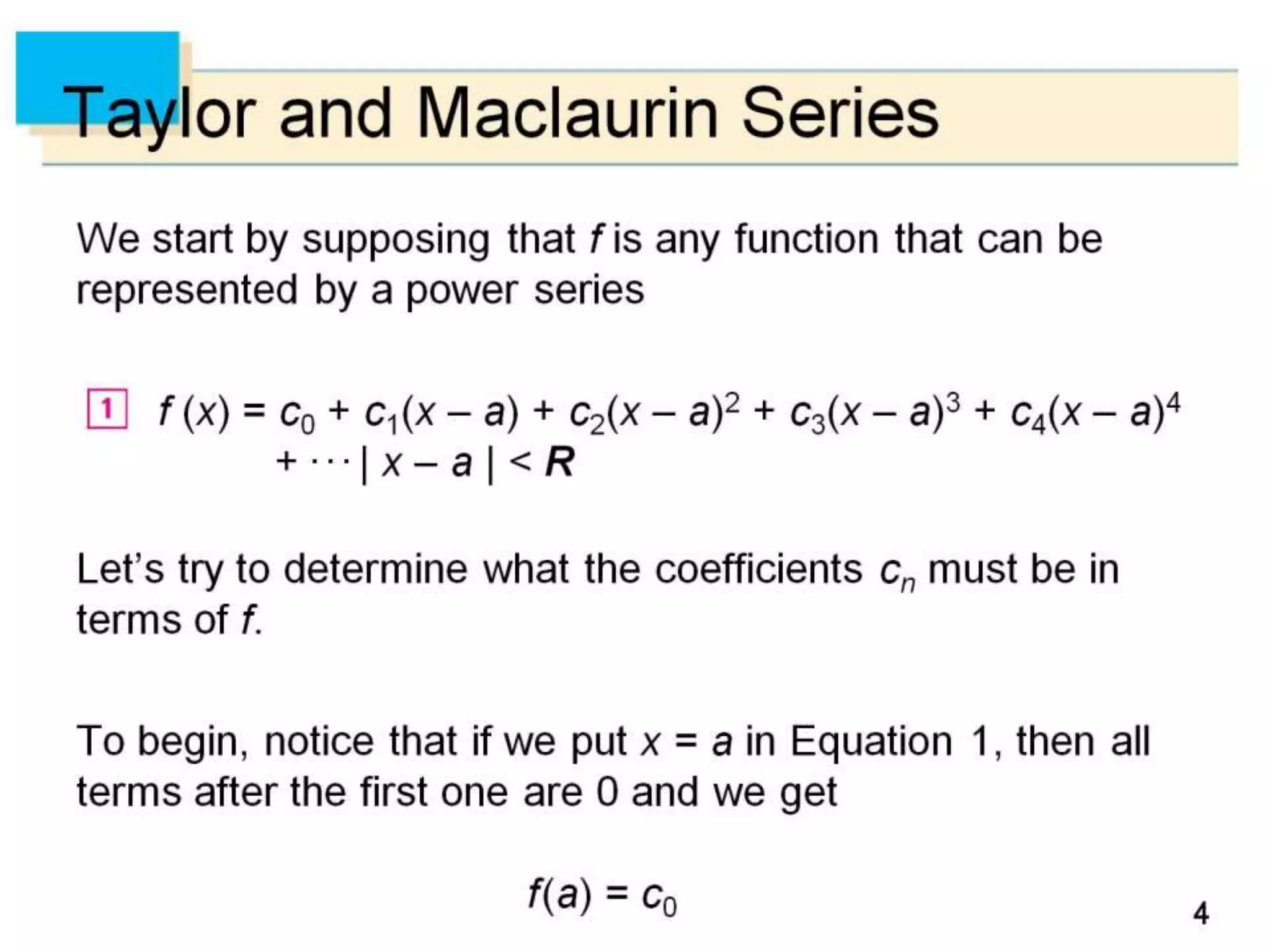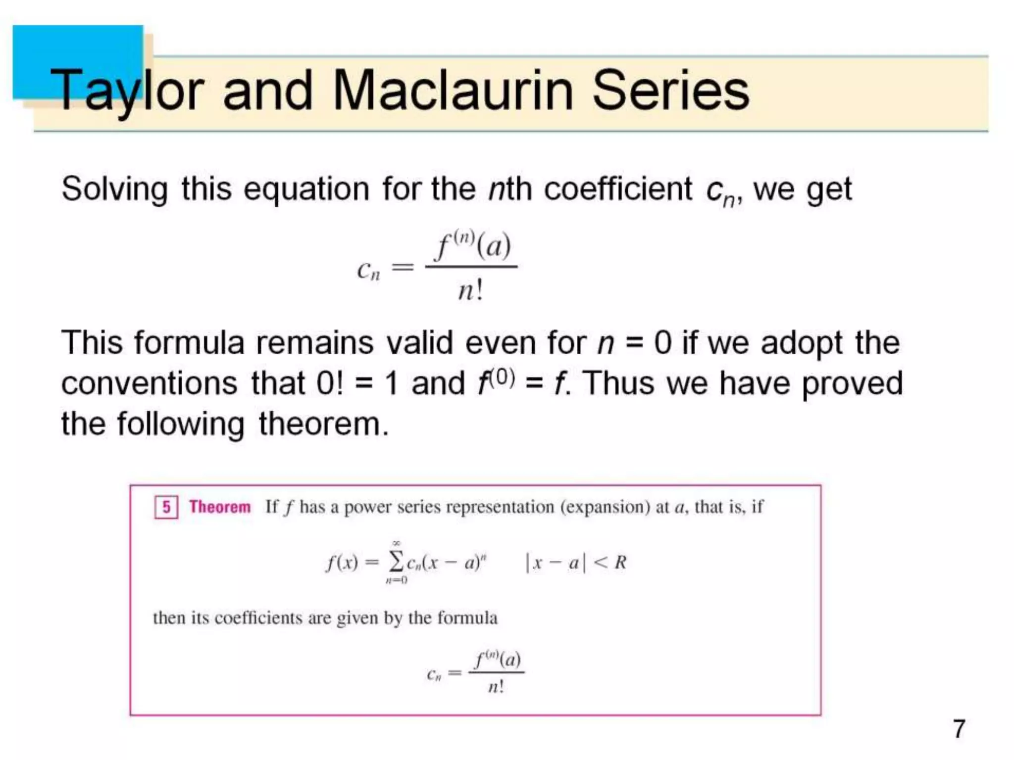 The document defines power series as sums of terms involving constants multiplied by powers of x, where x can be centered at 0 or another constant a. It states the convergence theorem for power series: if a power series converges at a point c ≠ 0, then it converges absolutely for all x within |c|, and if it diverges at a point d, then it diverges for all x outside |d|. It introduces the radius of convergence R, where a power series converges absolutely for |x-a|<R and diverges for |x-a|>R, regardless of what happens exactly at R.
