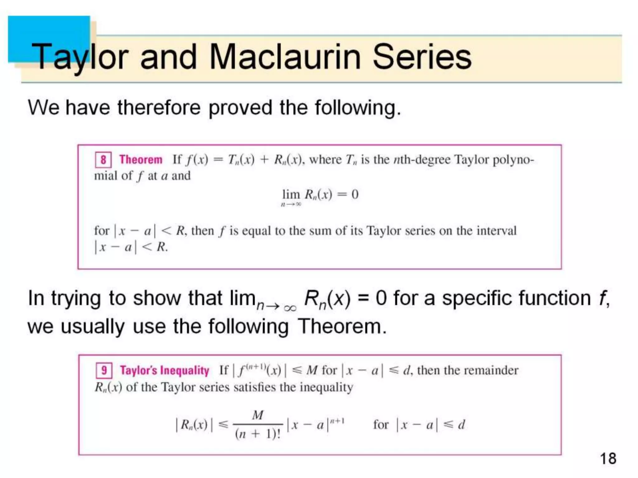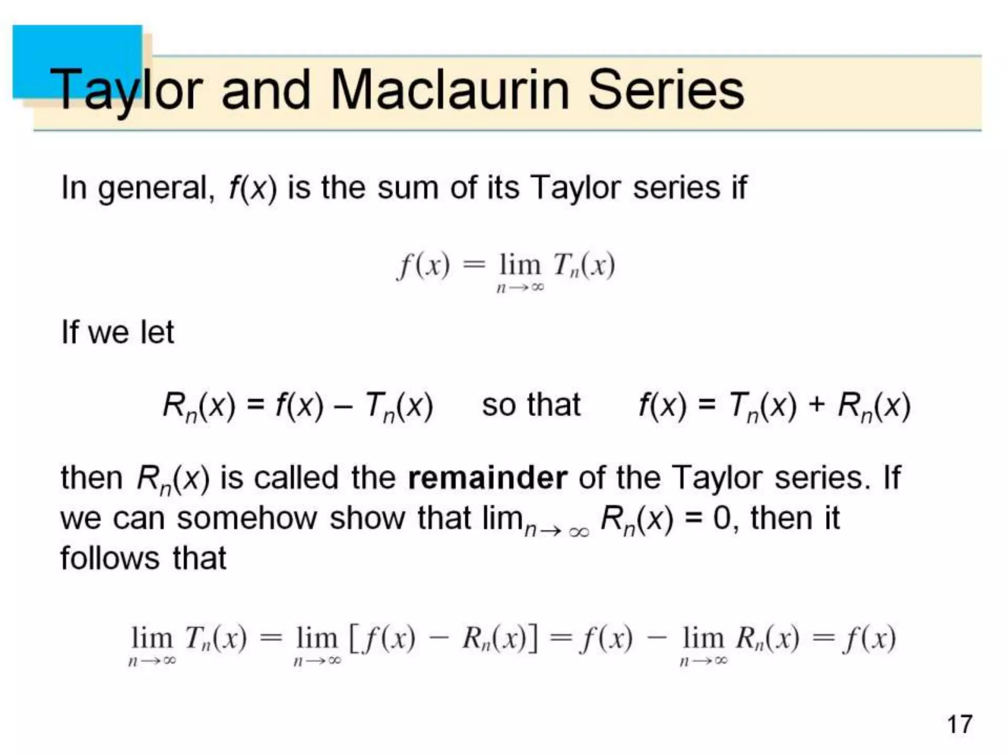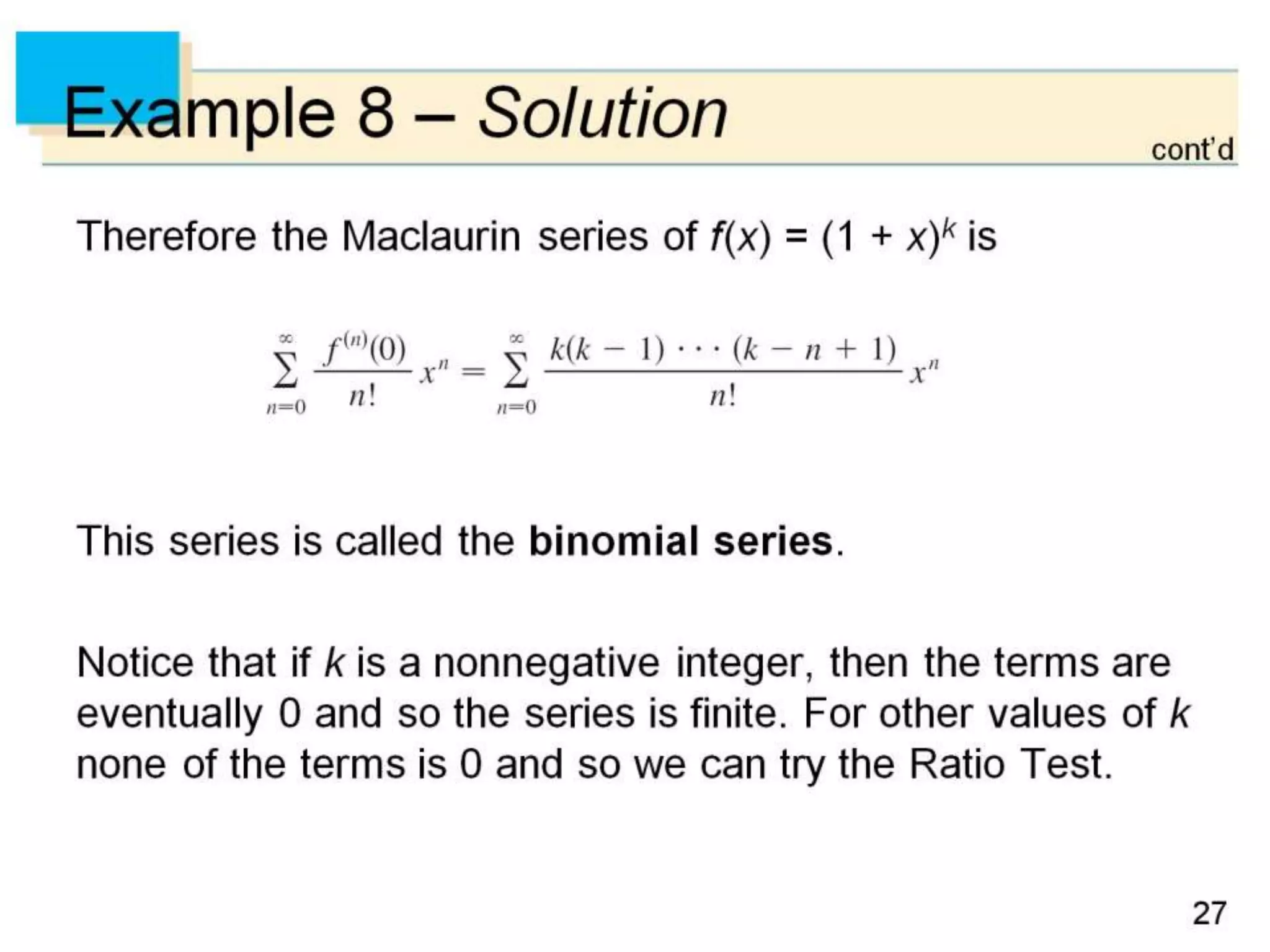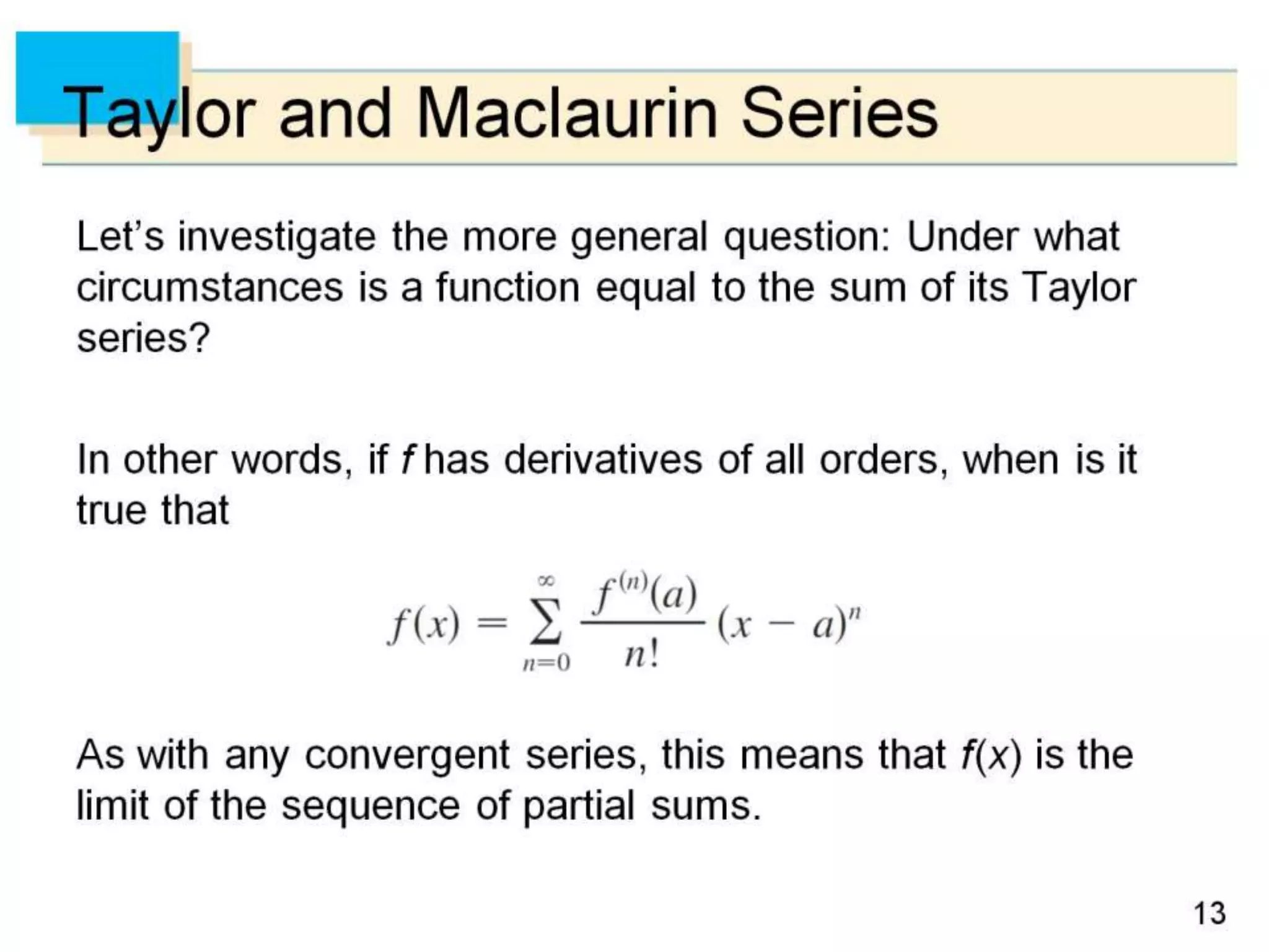 The document defines power series as sums of terms involving constants multiplied by powers of x, where x can be centered at 0 or another constant a. It states the convergence theorem for power series: if a power series converges at a point c ≠ 0, then it converges absolutely for all x within |c|, and if it diverges at a point d, then it diverges for all x outside |d|. It introduces the radius of convergence R, where a power series converges absolutely for |x-a|<R and diverges for |x-a|>R, regardless of what happens exactly at R.