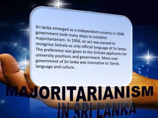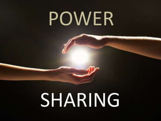Power sharing is a technique used in democracies to distribute power across different levels of government and groups. In India, power is shared between the central government and state governments. Belgium also employs power sharing between its Dutch-speaking and French-speaking communities through equal representation in government. Sri Lanka has faced civil war due to demands for independence from its Tamil minority, highlighting the need for power sharing between ethnic groups.
