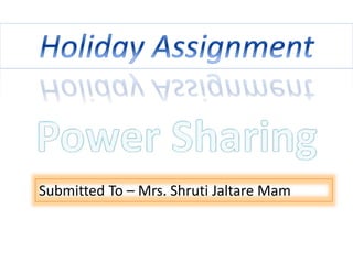 The document discusses different forms of power sharing in a democracy. It describes power sharing horizontally among different organs of government to maintain checks and balances. It also describes vertical power sharing between central, state, and local governments. Additionally, it discusses power sharing socially by reserving positions for women, scheduled castes, and scheduled tribes, and among political parties through coalition governments. The goal of power sharing is to accommodate diverse social groups, avoid conflicts, and ensure no single group can impose its will without consideration of others.