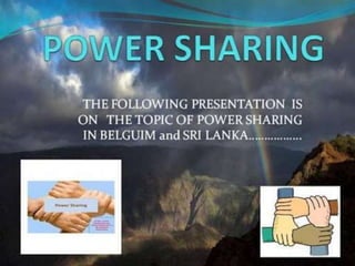 The document summarizes the ethnic composition and conflict in Sri Lanka. It states that the Sinhalese community makes up 74% of the population and the Tamils make up 18%, with 13% being Sri Lankan Tamils and 5% being Indian Origin Tamils. Preferential policies favoring the Sinhalese majority led to distrust between the communities and eventually a civil war, killing thousands on both sides. In contrast, Belgium adopted power-sharing amendments to accommodate linguistic communities, with equal Dutch and French speaking ministers, and devolved powers to state and Brussels governments with equal representation of parties.