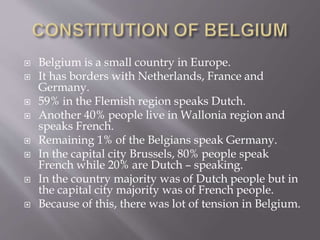 Belgium accommodated linguistic tensions between Dutch and French communities through constitutional reforms that established power-sharing arrangements. This included equal representation of both communities in government. In contrast, Sri Lanka failed to share power between the Sinhala Buddhist majority and Tamil Hindu minority, denying Tamils' rights and sparking civil war as distrust increased. Power-sharing is desirable to reduce conflict between social groups and reflects democratic values of inclusive governance.