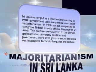 Power sharing is a technique used in democracies to distribute power between different entities to prevent concentration of power in one place and allow for checks and balances. In Sri Lanka after independence, a series of majoritarian policies established Sinhalese supremacy over Tamils, including making Sinhala the only official language. This caused conflicts and distrust between Sinhalese and Tamil communities, eventually leading to a civil war as Tamil groups demanded an independent state in the north and east of the country.
