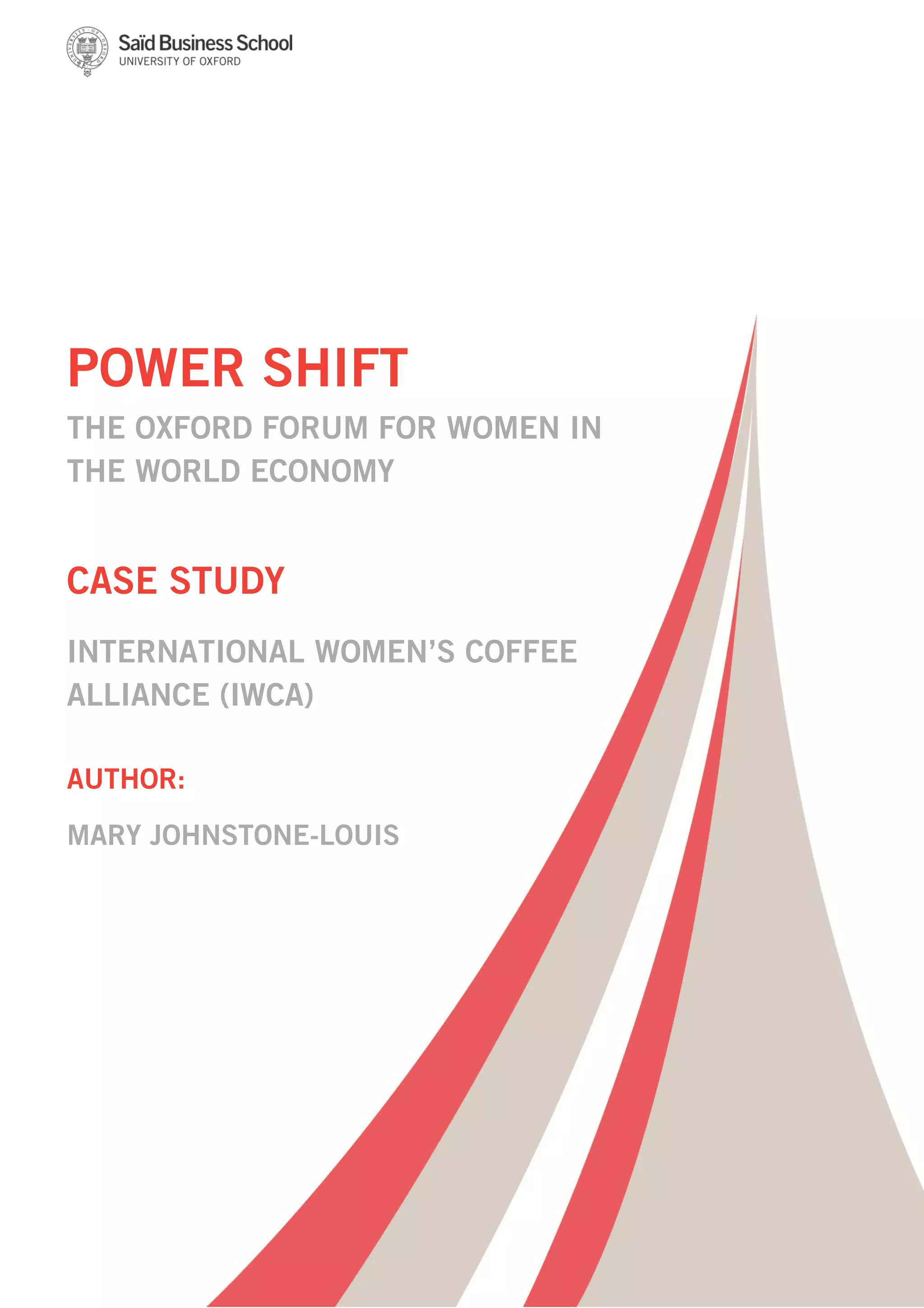 The document discusses the International Women's Coffee Alliance (IWCA), an organization that connects women across the global coffee supply chain. IWCA was founded to address the lack of women's participation and leadership in the industry, despite women performing most of the labor involved in coffee cultivation. The organization supports coffee growing cooperatives led by women in developing countries. However, IWCA faced challenges in helping these groups access larger commercial markets. The document considers different options for IWCA to develop a brand that would make women-produced coffee more appealing and competitive for major buyers.