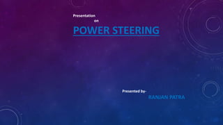This document presents information on power steering. It discusses the history of power steering from its invention in 1876 to its use in automobiles and agricultural vehicles. It describes the key components of power steering systems, including the reservoir, steering gearbox, rotary valve, and pump. It also covers the different types of power steering such as hydraulic, electro-hydraulic, and electric systems; and compares their workings. The document concludes by noting the advantages of power steering in reducing driver fatigue while providing easy steering control and its common applications in modern vehicles.