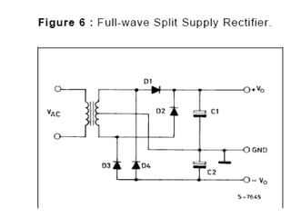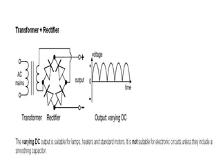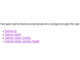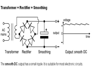 This document discusses power supplies and switched mode power supplies (SMPS). It begins with an overview of power supplies and their basic components like transformers, rectifiers, and regulators. It then covers the categories of power supplies, including linear regulated and SMPS. The document discusses the components and workings of SMPS in detail, including the inverter, output transformer, rectifier and filter. It covers the advantages of SMPS like higher efficiency and smaller size compared to traditional power supplies. In the end, it discusses different feedback techniques used in SMPS.