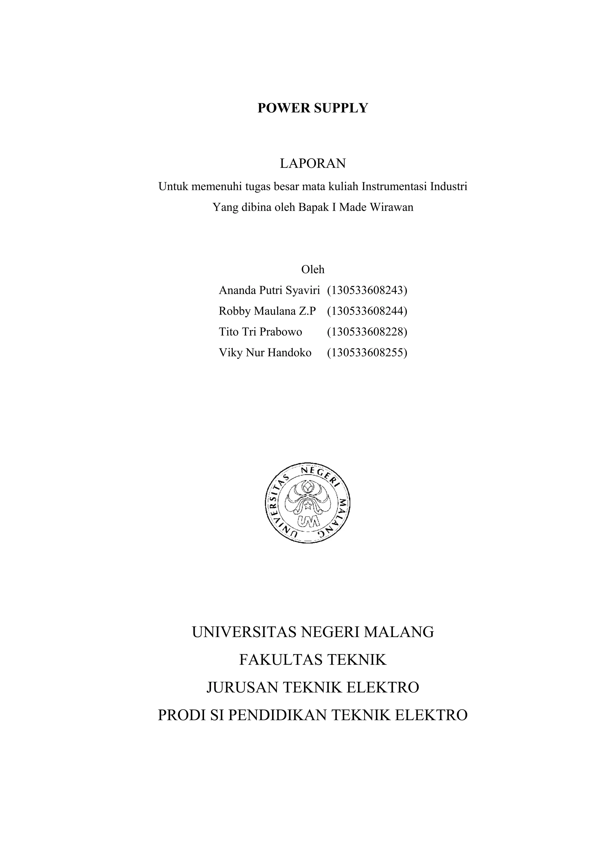 Laporan ini membahas tentang pembuatan power supply secara sederhana untuk memenuhi tugas mata kuliah Instrumentasi Industri. Laporan ini menjelaskan tujuan, dasar teori, komponen, cara kerja, dan hasil dari pembuatan power supply tersebut."