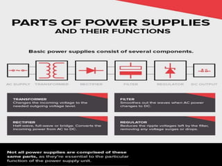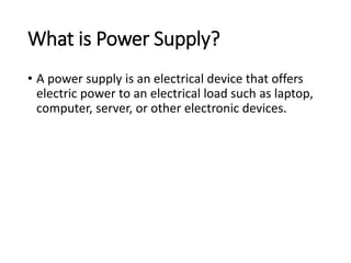 A power supply converts electric current from an energy source to the correct voltage and frequency required to power electrical devices like computers and electronics. It performs key functions like changing voltage levels to match the load's requirements in order to prevent overloading and damage. Power supplies are also needed to regulate output and filter fluctuations to provide steady power for sensitive devices. They come in different types depending on the input and output power needs.
