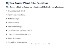 The factor whichincludes for selection of Hydro Power plant are: