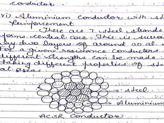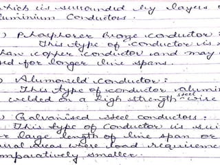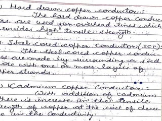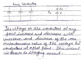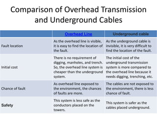 The document compares overhead transmission lines and underground cables. It discusses that overhead lines have easier fault location, lower initial cost, higher chance of faults, lower safety, shorter useful life, and lower maintenance cost than underground cables. Underground cables have more difficult fault location, higher initial cost due to trenching requirements, lower chance of faults, higher safety as cables are underground, longer useful life, and higher maintenance cost to locate and repair faults. The document also discusses parameters of transmission lines like resistance, inductance, capacitance and classifications of transmission lines by length.