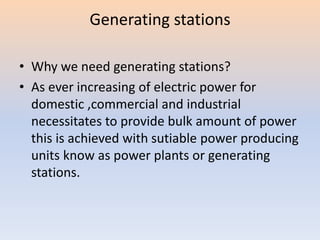 The document discusses various types of power generating stations, including steam, hydroelectric, diesel, and nuclear power plants, detailing their operational principles, advantages, and disadvantages. It emphasizes the need for generating stations due to increasing electricity demand and highlights key design considerations for efficient power generation. Each type is evaluated for its fuel costs, efficiency, environmental impact, and suitability for different geographic locations.