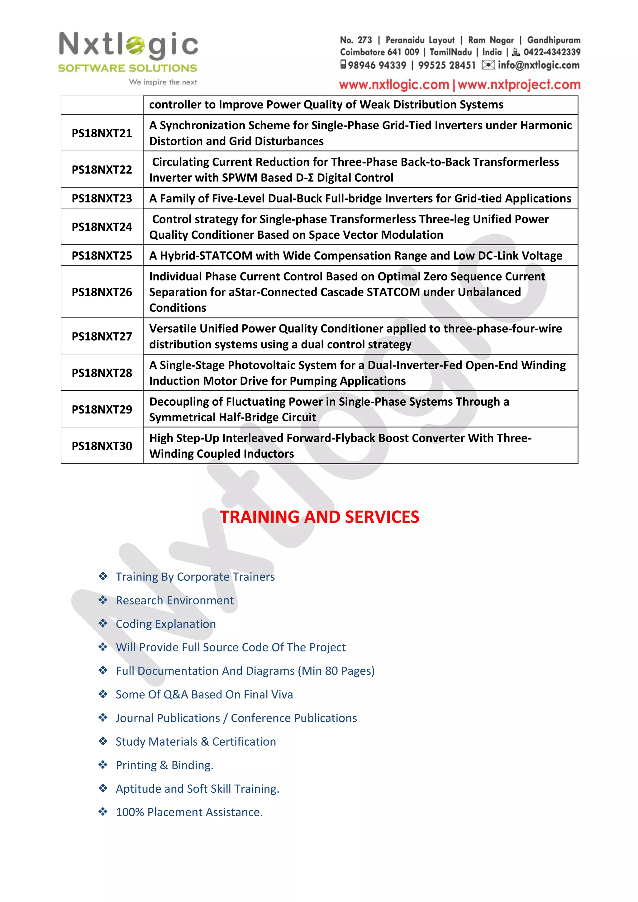 This document lists 30 project titles related to power systems and IEEE papers for 2018. The projects cover topics such as STATCOMs, active power filters, grid-connected inverters, renewable energy integration, and power quality improvement. The document also describes training and services offered, including corporate training, coding explanations, documentation, publications, certifications, placement assistance, and job assistance during projects.