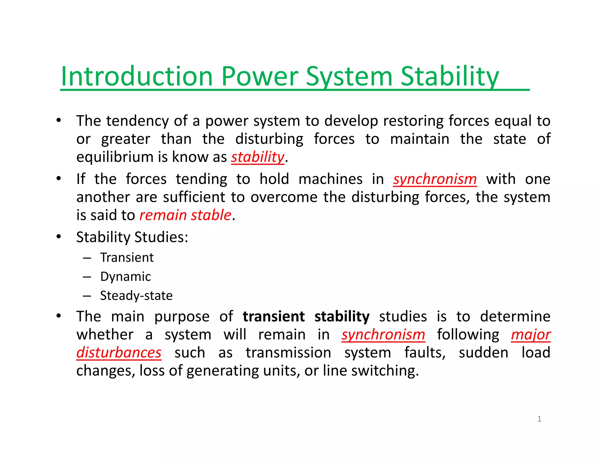 The document provides information on power system stability and transient stability studies. It introduces key concepts such as stability, transient stability studies, rotor dynamics, the swing equation, and the power-angle equation. The swing equation describes the acceleration of a generator's rotor and relates the mechanical input power to the electrical output power. The power-angle equation models the relationship between generator output power and the power angle during transient stability studies.