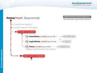 The document discusses how Drupal handles theming and markup. It explains that Drupal uses theme hooks and theme functions to call themeable output. Theme hooks are defined in a theme's hook_theme() implementation and associated with template files or theme functions. The document outlines how subthemes inherit properties from their parent themes, and provides tips for universally theming forms and specific forms in Drupal.