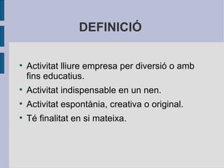 DEFINICIÓ Activitatlliure empresa per diversió o amb fins educatius. Activitat indispensable en un nen. Activitat espontània, creativa o original. Té finalitat en si mateixa.