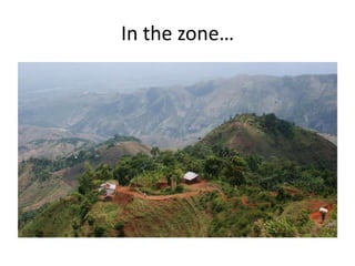The document discusses a mountain community in Haiti that studied and installed solar-powered water pumps. It describes how the community previously had to haul water from far distances, but through collaboration between organizations, they were able to install pumps powered by solar panels to make water more accessible. The project involved engineers, volunteers from the local area and abroad, and reviews from energy companies to set up a sustainable water system for the community using solar energy.