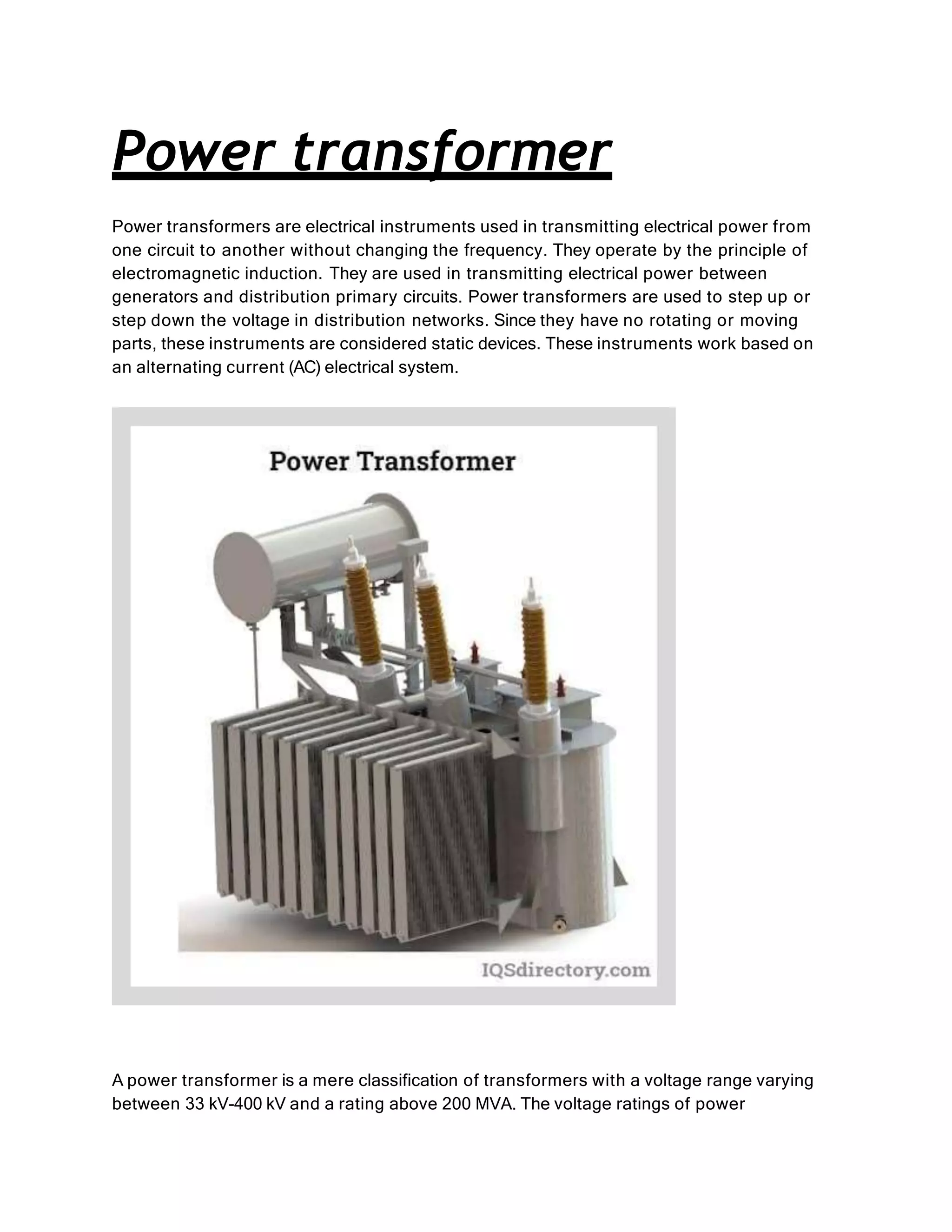 Power transformers are static devices used to transmit electrical power between circuits without changing frequency. They operate using electromagnetic induction and are used to step up or down transmission voltages. Power transformers have ratings between 33-400 kV and above 200 MVA. They are essential for minimizing energy losses during long distance power transmission by increasing voltage for transmission then decreasing it for distribution. Power transformers work by inducing an emf in the secondary winding through a fluctuating magnetic field produced in the primary winding according to Faraday's law of induction. The number of turns in each winding determines whether the transformer steps up or down the voltage. Key components include the core, windings, insulating materials, tap changers, bushings, tank, conservator, breather