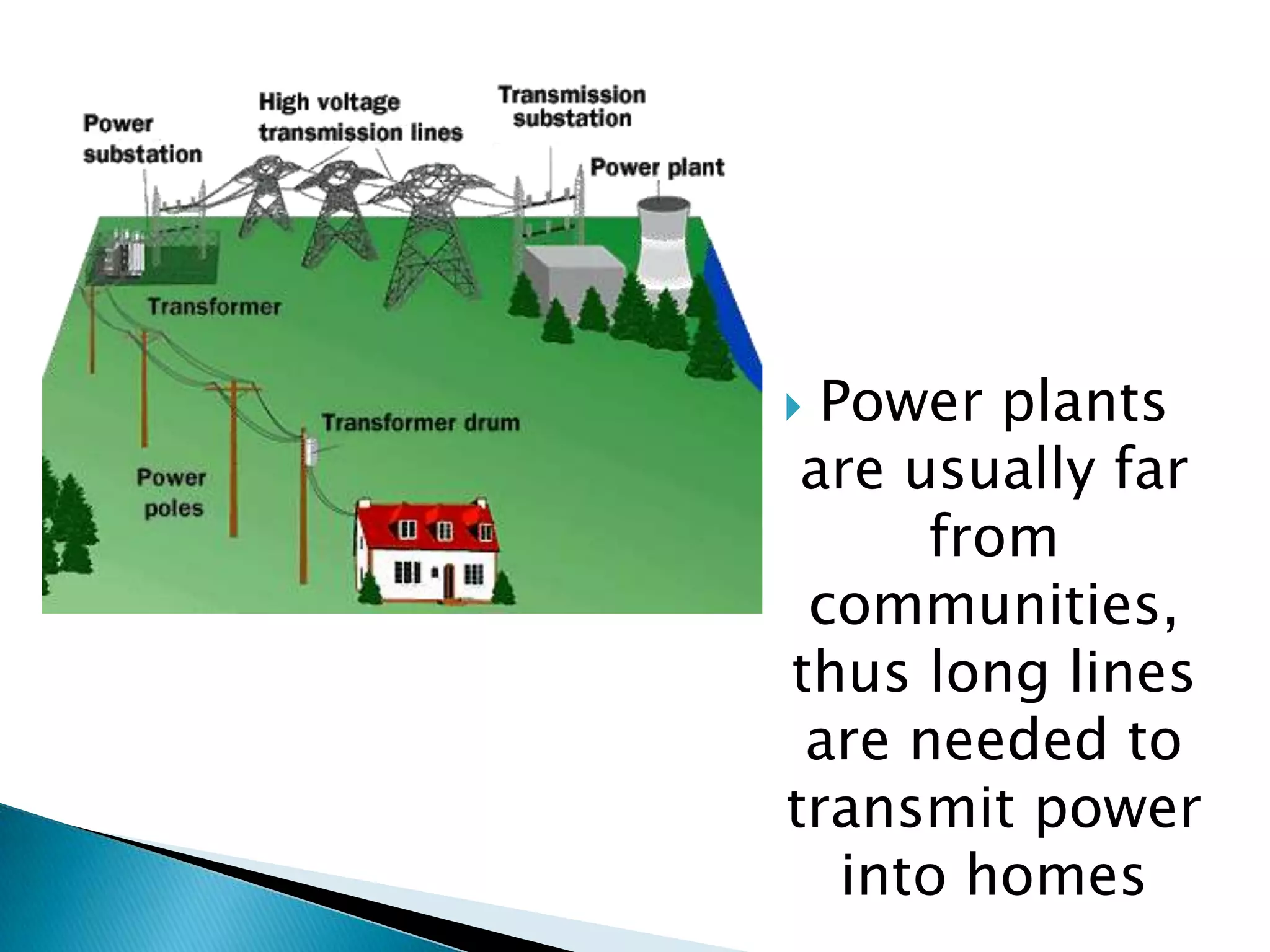 Power plants are located far from communities, requiring long transmission lines to transmit power to homes. Transmission losses are reduced by transmitting power at high voltage and low current, which necessitates the use of step-up transformers at power plants and step-down transformers before distributing power to homes.