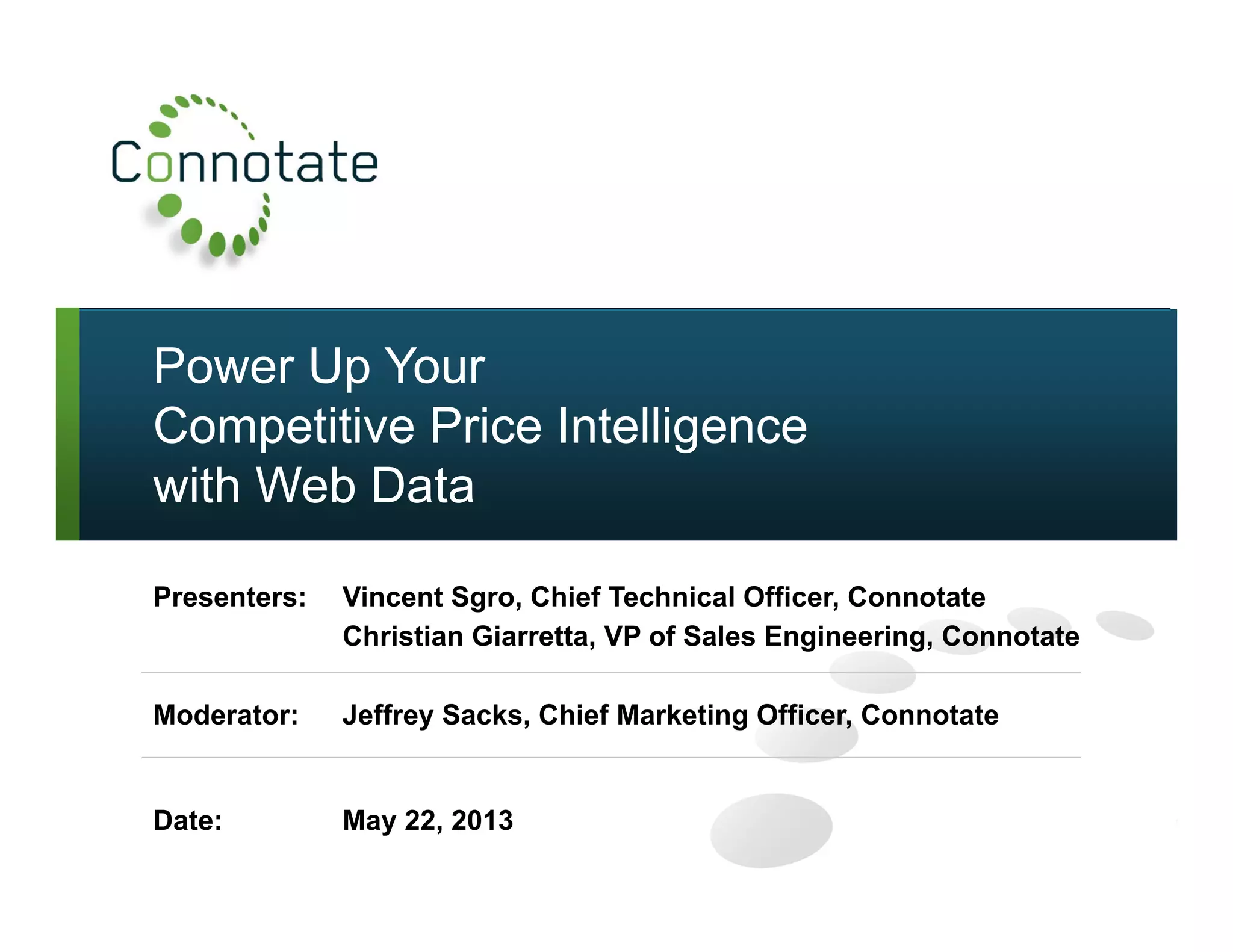 The document discusses the impact of web data on competitive price intelligence, highlighting how transparency has changed in the supply chain. It outlines various use cases for extracting competitive pricing data from the web and emphasizes the importance of data accuracy. The presenters advocate for leveraging web data to optimize pricing strategies and enhance market intelligence across different industries.
