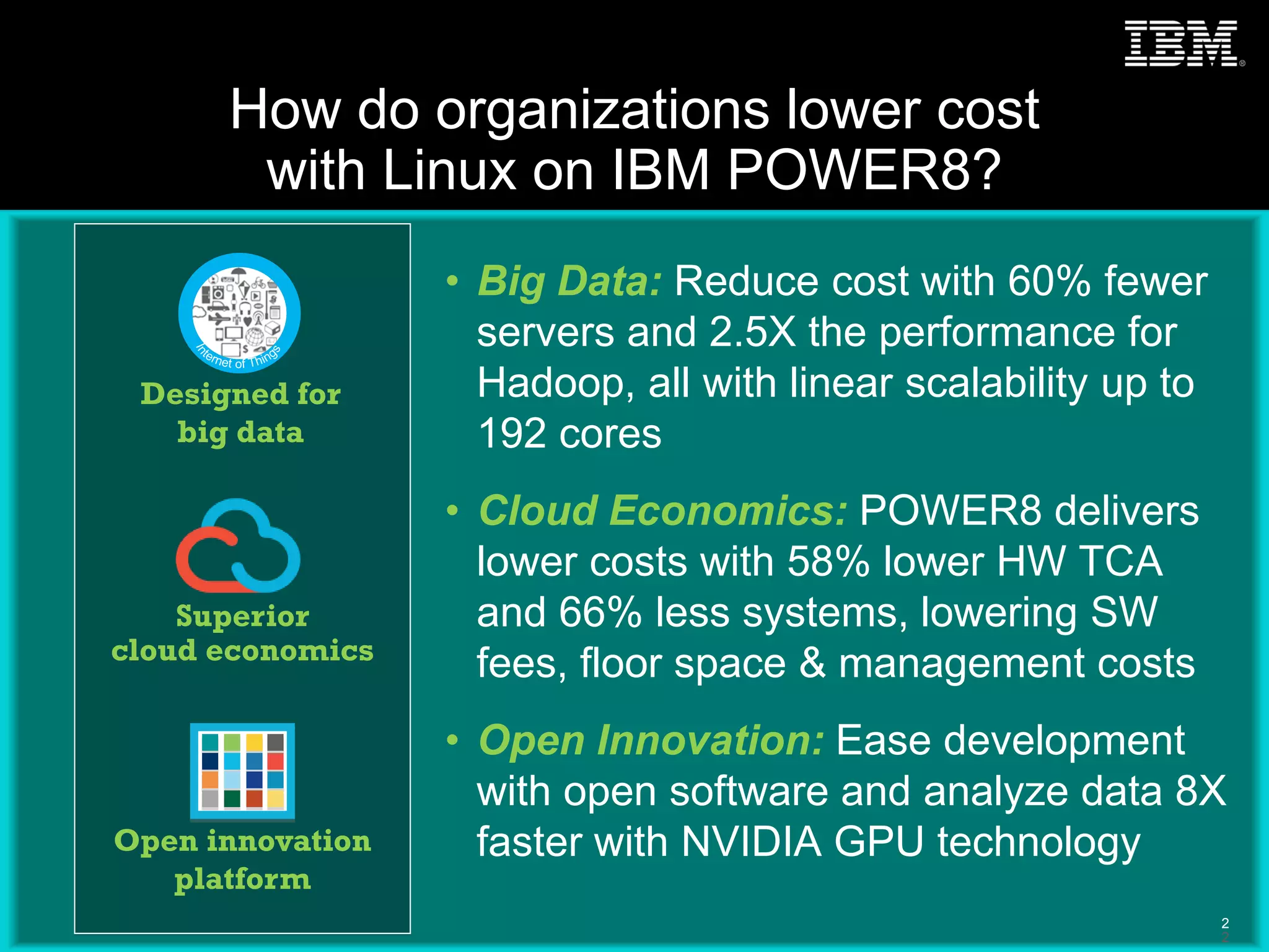 The document outlines how IBM Power8 technology helps organizations lower costs and improve performance through various applications like big data processing, cloud economics, and supply chain management. Key benefits include reduced hardware costs, improved scalability, and enhanced performance with integrated NVIDIA GPU technology. It emphasizes the platform's ability to support real-time analytics and higher user throughput in cloud-based environments.