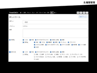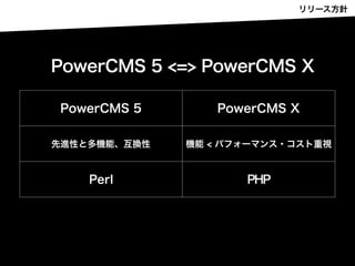 The document discusses the PowerCMS content management system and its templating features over multiple versions. It provides code examples of templating tags for variables, loops, and conditional logic across different versions of PowerCMS and other CMS platforms. It also references plans to release new editions of PowerCMS Professional and Enterprise in future quarters and years.