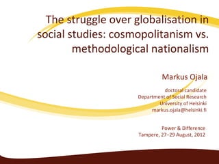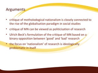 This document discusses the critique of methodological nationalism in social studies research. It summarizes Ulrich Beck's formulation of the critique, which presents a binary opposition between 'good' cosmopolitan research views and 'bad' nationalistic research views. However, the document also questions whether cosmopolitanism is truly superior and non-ideological. It argues that methodological nationalism is just one research ideology among others, and not all globalization research takes a cosmopolitan approach.