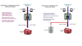 Power factor is the ratio of real power to apparent power in an AC circuit. A low power factor is caused by inductive loads that introduce reactive power and lower the power factor. Improving the power factor reduces utility bills, lowers voltage drops, and makes motors and transformers more efficient. Capacitors can be added to provide reactive power and oppose the reactive power drawn by inductive loads, thereby improving the power factor.