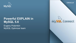 The document discusses the EXPLAIN statement in MySQL. It provides examples of using the traditional EXPLAIN output and the new JSON format for EXPLAIN. The JSON format provides more detailed information about the query plan and execution in a structured format. It allows seeing things like how conditions are split and when subqueries are evaluated.