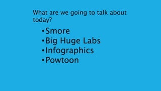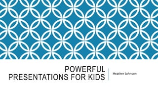 This document discusses various technology tools that can be used to create powerful presentations for kids, including Smore, Big Huge Labs, infographics, and Powtoon. It provides examples of how each tool can be used in the classroom, such as using Smore to create a classroom newspaper or book flyers, using Big Huge Labs to make biography magazine covers or book character trading cards, creating infographics about math concepts or science projects, and using Powtoon to make book reports or class introductions. The document encourages using these tools to integrate fun and technology into learning, foster cooperative work, and engage students in presenting content.