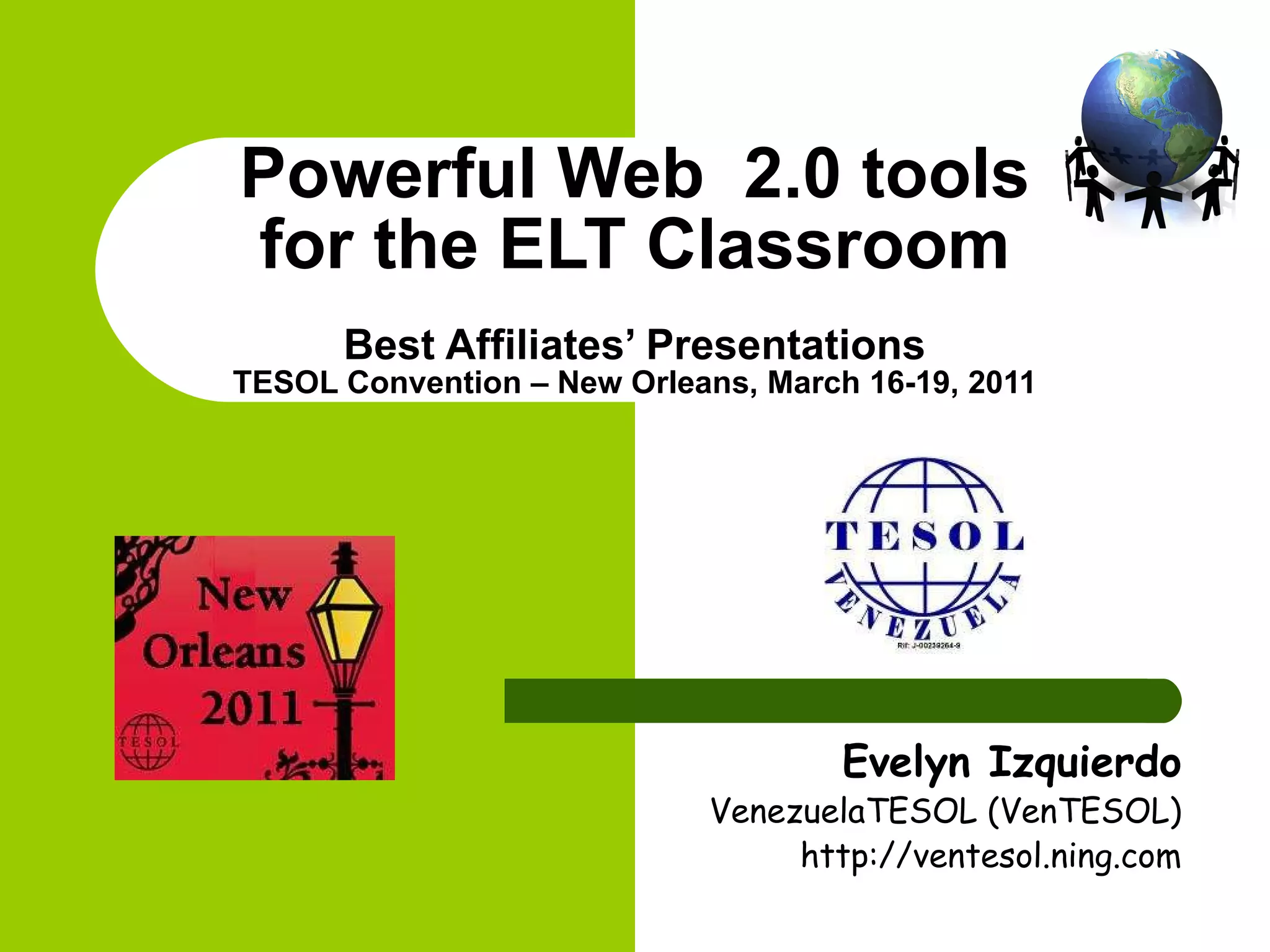 The document presents a comprehensive overview of Web 2.0 tools that can enhance English Language Teaching (ELT) practices, emphasizing the importance of digital literacy in the 21st century. It discusses various tools for communication, collaboration, and creativity, including blogs, podcasts, social networks, and virtual worlds, and their potential to engage students and improve learning outcomes. Additionally, it provides links to resources and further reading on ICT competency standards for teachers and effective technology integration in education.