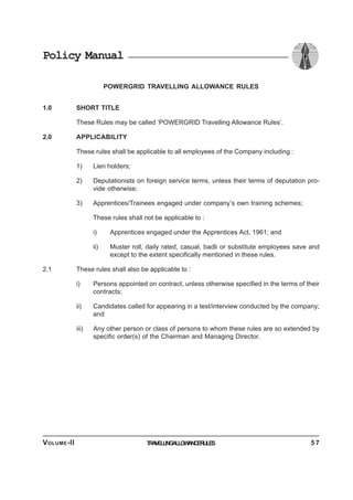 This document provides an overview of the contents and chapters of the POWERGRID Travelling Allowance Rules policy manual. It includes 7 chapters that cover the short title, applicability, scope, definitions, entitlement of travelling allowance on official tours within India, and reimbursement of journey fares and conveyance charges for employees. The document defines key terms, specifies entitlements for travel by rail, air and road based on an employee's level/pay range, and provides rules around reimbursement for travel expenses.