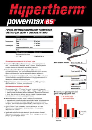 Документ описывает механизированные и ручные плазменные системы резки металла с указанием рекомендуемых параметров и характеристик, таких как скорости резки для различных толщин материалов. Упоминаются основные преимущества технологии и оборудования, включая автоматическую регулировку давления газа и улучшенные характеристики резаков. Также представлены технические данные для различных конфигураций и источников питания, а также информация о гарантии и соблюдении стандартов.