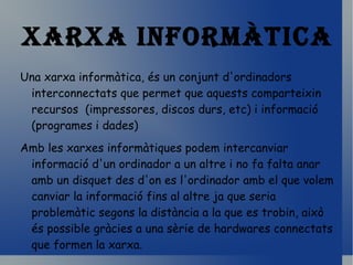 Xarxa Informàtica Unaxarxa informàtica, és un conjunt d'ordinadors interconnectats que permet que aquests comparteixin recursos (impressores, discos durs, etc) i informació (programes i dades)