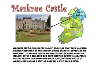 Markree Castle in County Sligo has been restored as a luxury hotel, set on 500 acres with views of the surrounding countryside. Kilkenny Castle was built in the 12th century by the Normans to control a river crossing and trade routes. Ashford Castle on Lough Corrib in County Mayo was originally a 13th century castle of the Burke family and is now a luxury hotel.