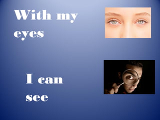 This document discusses the five senses and what each sense can perceive. It asks questions about what each sense can see, smell, taste, touch, and hear, then provides examples for each sense, such as seeing colors, smelling flowers and coffee, tasting foods, touching textures, and hearing sounds at different volumes.