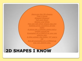 The document discusses different 2D geometric shapes including circles, triangles, squares, and rectangles. It provides examples of objects that represent each shape, such as a pizza being circular, a yield sign being triangular, and a photo frame being square. It also notes that shapes can be identified by counting their sides. The document contains repetitive descriptions of shapes and examples throughout.