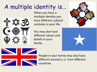A person with a multiple identity may have different cultural outlooks and values from their family who have ancestry from different countries. They have both a local identity through their community involvement as well as national and global identities from traveling, having an international family, and recognizing our shared humanity.